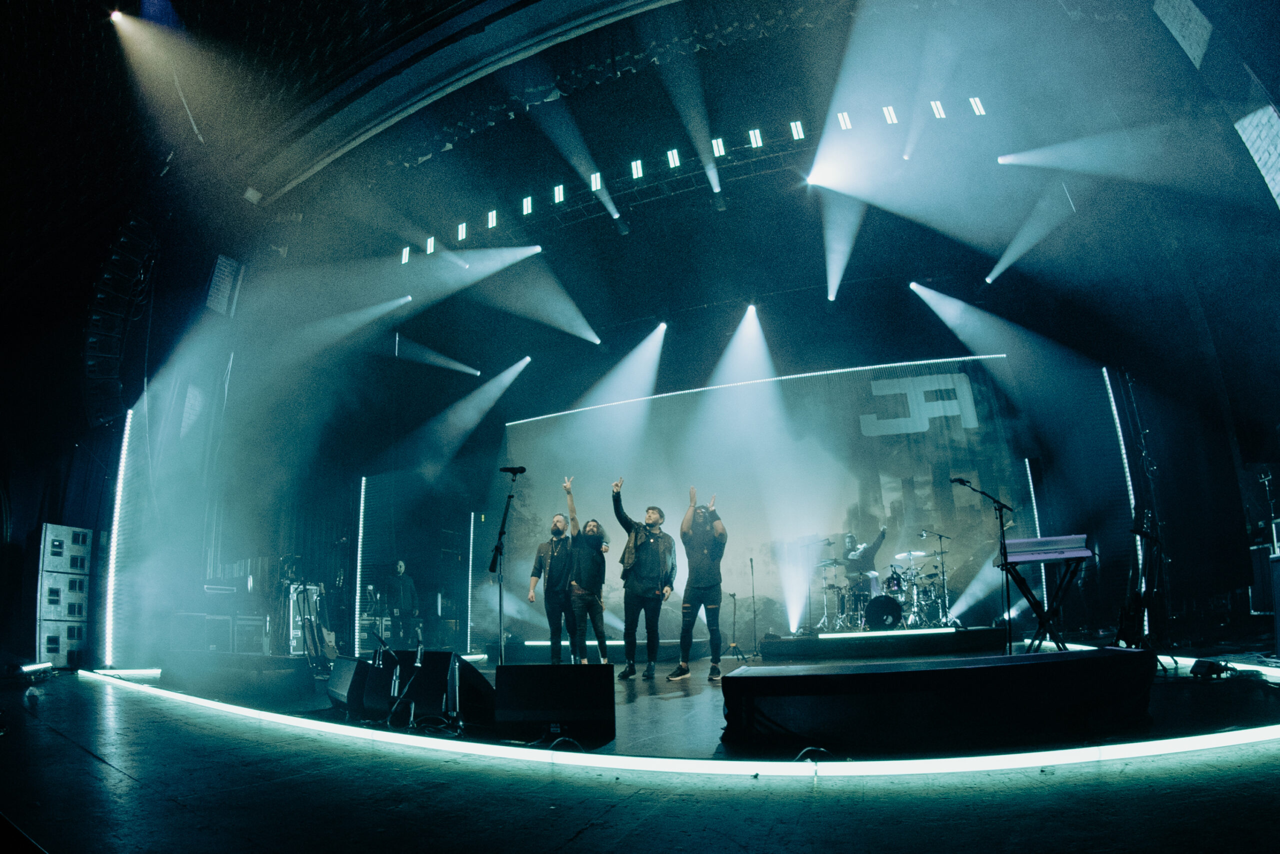 In March of 2022 we undertook James Arthur’s UK Tour in support of his newest album It will all make sense in the end. Right from inception James wanted to incorporate the new album’s artwork and post apocalytpic feel to the show. We designed a custom backdrop coated in UV Material that also allowed for light to shine through. Completing the look we framed the stage with various GLP fixtures and Chavet Epix to draw the eye to the centre of the stage.
